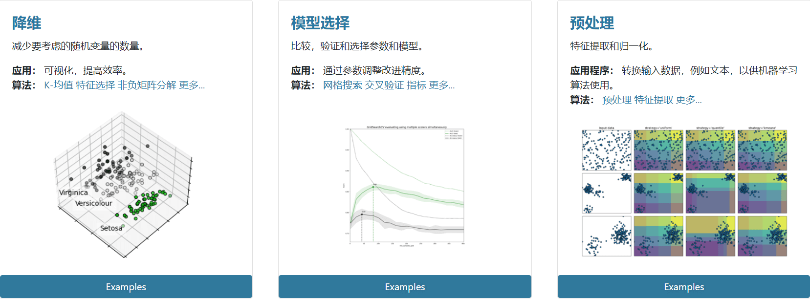 在sklearn有中有六大任务模块:分别是分类、回归、聚类、降维、模型选择和预处理。