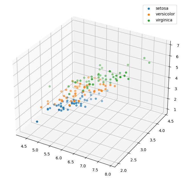 包含的三种鸢尾花的四个特征,分别是花萼长度(sepal length)、花萼宽度(sepal width)、花瓣长度(petal length)、花瓣宽度(petal width)。