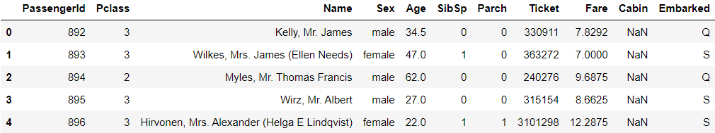 - test.csv:预测集,通过使用训练出来的模型预测乘客是否存活,包含了除Survived的所有字段。