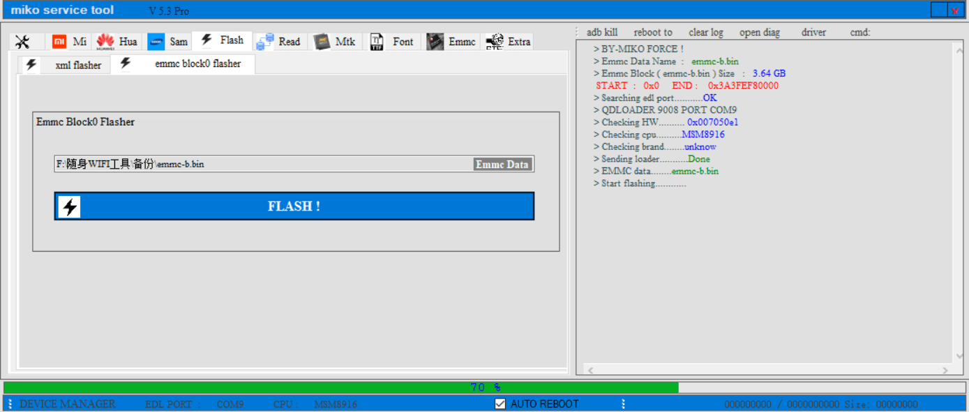 首先要进入9008模式,然后点击Flash,再点击emmc block0 flasher。选择之前的全量备份,点击flash恢复。